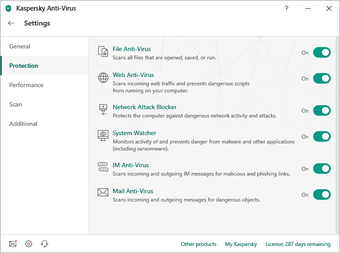 Kaspersky Anti-Virusには、奇妙な動作をしているファイルをブロックする自己防衛メカニズムも含まれています。データベースでまだ認識されていない潜在的なマルウェアからの攻撃を防ぐのに役立ちます。それに加えて、Kasperskyのこの新しいバージョンはランサムウェアに対する追加の保護を提供します。